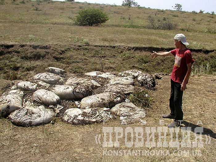Заинтересовавшись, корреспонденты «Провинции» выехали на место, взяв в проводники Владимира Васильевича, выпасающего в этом районе коров, и знающего местность, как свои пять пальцев. Мы обнаружили на городской окраине ужасную картину. Шокирующий пейзаж находится на самых задворках поселка Червоного, - в балке чуть выше ветсанутильзавода. Груды гниющих внутренностей животных, упакованных в мешки, свалены кучей в одну из лощинок и отравляют горячий степной воздух ядовитыми миазмами, кругом вьются полчища мух, разлагающуюся массу терзает целая стая крупных воронов-падальщиков.